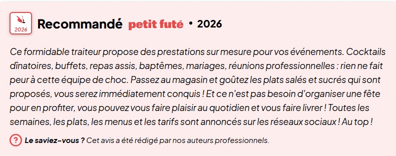 « Nous avons fait 2 repas d’anniversaire de mariage avec ce traiteur et nous en sommes ravis. Tout était très bon, budget demandé respecté avec des produits de qualité. Présentation bien soignée et agréable à voir. Nous recommandons. »